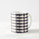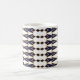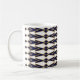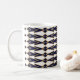 Esta taza tiene un diseño art deco de triángulos y diamantes que parecen bolas en azul y oro.