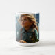 White ceramic cup printed with a dreamy outdoor portrait of a child wearing a jean vest and backpack, hair lifted by the wind against a blue sky with clouds.