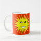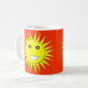 Este sol amarillo sonriente brillante aparece a ambos lados de esta linda taza y está garantizado que te hará sonreír incluso en los días más miserables. Está sobre un fondo rojo cálido y tiene una gran boca de carita blanca y enormes ojos negros con pupilas blancas.