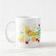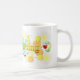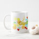 Mug alegremente decorada con colores vivos y brillantes con burbujas y corazones y rayos de luz para empezar el día con tu mejor humor