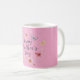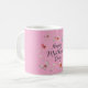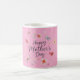 Happy Mother's Day coffee mug with floral and butterfly pattern on a plain pink background.