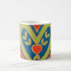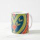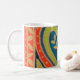 Un tazón de café blanco con un diseño de corazón decorativo en rojo, azul, verde y dorado de una pintura acuarela de Judy Adamson.