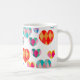Esta taza tiene un diseño Art Déco de corazones hechos de diamantes en tonos rosados, azules, verdes, dorados y rojos.