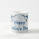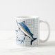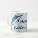 No muchos peces son más increíblemente hermosos que el marlin azul — y no muchos peces son más grandes. El marlin azul es el más grande de los marlins del Atlántico y, en serio, uno de los peces más grandes del mundo. Como con algunas especies, la hembra es a menudo un poco más grande que el macho. Las mujeres pueden crecer hasta 4 metros de largo y pesar más de 1900 libras, aunque el promedio es de unos 11 pies de largo por 300 libras. Un azul profundo en la parte superior y un blanco plateado debajo, con una aleta dorsal pronunciada y una mandíbula superior larga, letal y en forma de lanza (a la que algunos se refieren como una cuenta), los marlins azules son uno de los peces más fácilmente identificables y reconocibles del mundo. Marlins es conocido por su increíble resistencia en una lucha cuando están enganchados, lo que los convierte en uno de los favoritos de los pescadores de grandes juegos. Aunque también se puede decir de prácticamente cualquier pez super grande, no puedo imaginar que haya mucho más emotivo para el ávido pescador que enganchar a uno de estos gigantes y verlo romper el agua en la lucha. Este diseño rinde homenaje a este majestuoso pez más que a los pescadores que lo buscan. Para esta maravillosa taza de café, dos marlins enmarcan un elemento de texto, "Feliz Día del Padre". Obviamente, una excelente elección para el Día del Padre, usted es bienvenido a modificar el texto para que se adapte mejor a su celebración para su angloparo favorito.