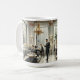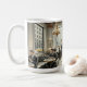 Perfecto regalo para los amantes del viaje y del café. La pintura acuarela exuda la serena elegancia del café The Gilded Cup en el distrito financiero de San Francisco. En el interior, las elegantes encimeras de mármol y las lámparas de araña de cristal ornamentan un ambiente de sofisticación. Un hombre con traje de carbón vegetal bebe un blanco plano por la ventana, mientras una mujer con blusa blanca y bufanda de seda recorre su tablet al lado de una tetera de porcelana. El barista, vestido de negro, pone a disposición de los clientes una máquina espresso de latón brillante en el mostrador. En otra mesa, un grupo de compañeros comparte una mesa de charcutería, con unos maletines de cuero pulido muy cerca. Los ventanales del suelo al techo revelan las bulliciosas calles de San Francisco, enmarcadas por una paleta de grises mudos e iluminadas por la luz dorada. La exuberante vegetación de higos y orquídeas de hojas de vela aporta un toque natural y fresco a la lujosa escena.
