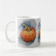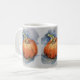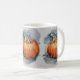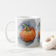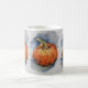 Una hermosa calabaza acuática en tonos naranjas con un fondo azul.