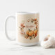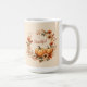 Una corona de bonito de calabazas y flores de otoño en tonos naranjas y neutros alrededor de la palabra "Agradecidos".