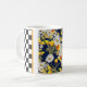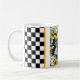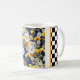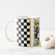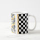 La hermosa y artística imagen presenta toneladas de coloridas margaritas blancas y manzanas naranjas sobre fondo negro con borde de tablero de ajedrez en blanco y negro