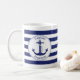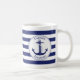 Esta taza náutica tiene un ancla con un borde circular de cuerda. La palabra "Capitán" está arriba y abajo es un nombre que usted debe personalizar. El fondo es de rayas azul marino y blancas.