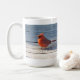 El animado cardenal campestre sobre un puente de madera, ¡hace un alegre comienzo del día! El cardenal Mug está disponible en varios tamaños, estilos que incluyen la taza de viaje.