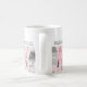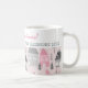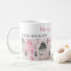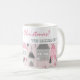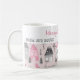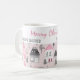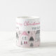 Un adorable patrón que presenta casas de acuarela de época en rosa, gris y blanco sobre un fondo rosado adorna la parte inferior de este tazón de café de vacaciones. "Feliz Navidad" está en un guion rosado en la parte superior con el sentimiento "Desde nuestra casa" y "de" nombres y fecha debajo. Pero todo el texto puede ser editado. Asegúrese de cambiar el ejemplo "de" nombres y fecha a los que desee.