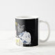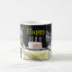 Cute and funny vintage photograph of two dressed cats sitting in a chair on a table, celebrating a birthday with cake and candles. Personalize by adding your own text.