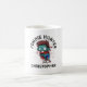 Un macabro tazón de café personalizado con un zombi de aspecto fresco, con ropa rasgada y desgastada con los brazos extendidos buscando brasas. Ojos vacantes grandes con una piel desecada y enferma. Sangre salpicada detrás de su cabeza. El texto dice cazador zombi, con letras curvadas. Personaliza con un nombre.