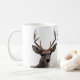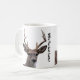 Esta taza tiene una foto de un ciervo que tomé. Un lado es de su cara mientras el otro lado muestra su cara con un poco más de su cuerpo. He escrito en la taza porque hice esto para mi hermano. Las palabras son fáciles de sacar. La jarra es blanca y el ciervo es blanco con tonos marrones.
