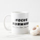 Esta taza de café presenta un diseño elegante de línea de texto que dice "Enfoque hacia adelante para un futuro mejor". Se puede personalizar el color de los elementos de diseño, así como el contenido textual de "Por un futuro mejor".