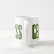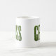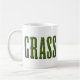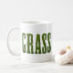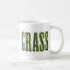 Coffee mug con la palabra GRASS. El texto está hecho de una foto de hierba para hacer que parezca como si estuviera cortado de caldo. Buen diseño para las empresas de cuidado y siembra de césped.