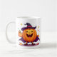 This adorable mug features a cute, cartoon pumpkin character with rosy cheeks, wearing a black witch hat and purple cape. The pumpkin holds a tiny jack-o’-lantern and gives a cheerful thumbs-up, surrounded by colorful candies and starbursts.