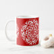 Esta mandala blanca se sienta sobre un fondo rojo brillante. El color es enérgico y cálido. Parte de la colección Kylgh Mandala.
