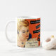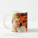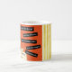 Feliz Cumpleaños taza, vintage, retro-estilo, naranja, oro, crema, personalizado. Imagen colorida de una mujer vintage, retro, con un vestido azul que sopla velas en una torta de cumpleaños. El fondo es naranja, crema y oro. Se fueron los días de escupir por todo tu pastel y compartirlo con tus amigos. Perfecto para añadir un toque de risa y estética vintage a su celebración, nuestra colección incluye tarjetas de cumpleaños humorísticas y una variedad de materiales y decoraciones de fiesta con temática vintage. Acepte el encanto eterno de antaño e infunda sus festividades de cumpleaños con un toque de ligereza.