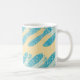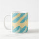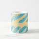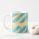 An artistic mug featuring a beautiful collage design inspired by traditional Japanese chiyogami (decorative paper). This elegant piece showcases a stunning contrast between turquoise blue and warm gold tones, adorned with delicate silhouettes of flowers and botanical elements dancing across the surface. The layered translucency of overlapping washi paper and handmade paper textures offer a contemporary interpretation of Japan's traditional craft beauty. This art-like mug transforms your tea time into a special moment of aesthetic appreciation.