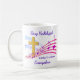 Modern SING HALLELUJAH CHRIST IS RISEN Christian Easter Coffee Mug with CUSTOMIZABLE NAME AND MONOGRAM, showing a gold colored empty cross in amongst colorful music staves. The Easter text appears in a mauve color. These words will be sung by Christians the world over to celebrate the resurrection of our Lord Jesus Christ at Calvary. This modern Christian Easter mug would make a great gift for birthdays, at Christmas, throughout the year, but particularly for Easter. Choose from a wide selection of Christian Easter designs on cards, invitations, home decor, clothing and gifts, designed by Berean Designs. Matching Christian gifts available.