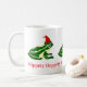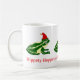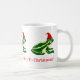 Enjoy your favorite holiday beverages in this festive Christmas mug featuring an adorable trio of frogs hoping (or is that hopping?) to join Santa's crew of elves. Caption on mug: Hippety Hoppety All The Way To Christmas!