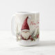 Two cheerful Santa gnomes in festive red hats and snowy white beards nestle among pine branches, red berries, and sparkling ornaments. Snowflakes drift gently around them, set against a warm beige backdrop that adds rustic charm. It’s a merry little scene that brings holiday magic to every sip—perfect for mornings wrapped in blankets and evenings by the fire. The words Merry Christmas and the year are also added. Personalize with the year of your choice