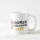 Church Challenge LIVE All Things Are Possible Coffee Mug, showing an orange flame with CHURCH CHALLENGE LIVE in white and orange typography. On the back, there is an extract from a Christian Bible verse based on Mark 9:23 - "All things are possible to those who believe."