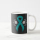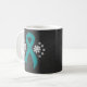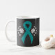 Cinta verde azulada y flores blancas en un diseño marcado. La cinta verde azulada representa la toma de conciencia de la agorafobia, trastorno de ansiedad, enfermedad de las gotas, trastorno de identidad disociativa, disfasia ectodérmica, alergias alimentarias, X frágil, miastenia grave, trastorno obsesivo-compulsivo, cáncer de ovario, víctimas de tsunami, conciencia del síndrome de Tourette, trastorno de pánico, kidor poliquístico Enfermedad renal, Síndrome ovárico poliquístico, esclerodermia, trastorno de estrés postraumático, enfermedad supranuclear progresiva. Abril es el mes de conciencia sobre el trastorno de estrés postraumático, el mes de toma de conciencia sobre violaciones y agresiones y el mes de toma de conciencia sobre el abuso de sustancias. May es el Mes de Concienciación sobre las Alergias a los Alimentos. Junio es el Mes de Concienciación sobre Escleroderma y Mes de Concienciación sobre Miastenia Gravis. Septiembre es el Mes de Concienciación sobre el Cáncer de Ovario y Mes de Concienciación sobre el Síndrome Ovárico Poliquístico. Octubre es el Mes de Concienciación sobre el Trastorno de Ansiedad.