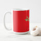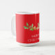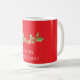 Festive red background with holly leaves, berries, pine cone and ornament, perfect for elegant holiday cards and seasonal decorations