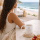 Beach-inspired neutral design featuring a wraparound taupe watercolor wash with gold serif text reading Sip Soothe Repeat. The fluid pattern pairs effortlessly with light wood desks, linen kitchens, or coastal breakfast nooks, making it ideal for daily coffee routines, slow mornings, or evening tea in a refined shoreline setting.