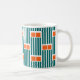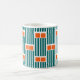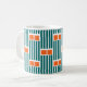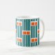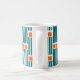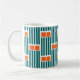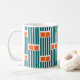 Esta taza tiene un diseño moderno de mediados de siglo compuesto por cinco líneas verde azuladas y dos rectángulos naranjas repetidos a lo largo del diseño.