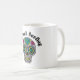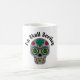 Hermosa letra "Estoy surfeando un cráneo" en una taza de café con un cráneo abstracto colorido y decorado para la temporada de Halloween.
