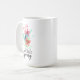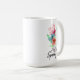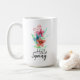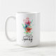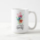 Taza de café de primavera linda con flores y hojas de acuarela naranja, rosa y azul. "Hello Spring" está en dos tipos de tipografía.