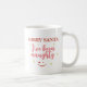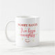 ¡Taza de café con cita navideña adorable! La cita es "LO SIENTO SANTA He sido travieso" en tonos de rosa y rojo con tipografía moderna y adornos dorados y una cara sonriente guiñando el ojo.