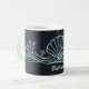 Un simple dibujo lineal minimalista de una concha de vieira, olas y algas marinas en verde espuma de mar, sobre un fondo verde muy oscuro en esta hermosa taza.