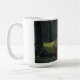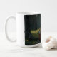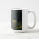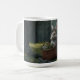 Esta taza muestra un conejo de Pascua dorado y blanco en el bosque con una cesta de sorpresas.