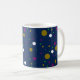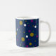 Un patrón de círculos de diferentes tamaños en oro, blanco, púrpura y verde se esparce a través de un fondo azul oscuro. Los círculos están uniformemente separados y varían en diámetro.