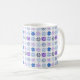 Esta taza tiene un diseño invernal de diferentes copos de nieve en azul y violeta en filas.