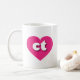 Esta taza presenta un corazón rosa vivo y vibrante que contiene las letras negrita, redondeadas, blancas bajas fundas ct, una versión juguetona de la abreviatura de Connecticut, el estado de la constitución.