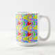 Mugs en un vibrante diseño multicolor con corazones rojos.