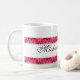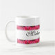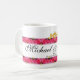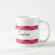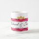 Con arte original diseñado por ZoeSPEAK para enamorados, esta Taza está bordeada arriba y abajo por una banda de rosas rosadas y corazones dorados. En el centro de la banda superior de rosas hay dos lazos de cinta dorada que forman un corazón donde se unen en el centro. Dos corazones de oro se unen a los lazos en el centro, completando el diseño. Los nombres de la pareja están en escritura negra sobre el fondo blanco entre las rosas, con la fecha especial debajo. Todo el texto está configurado para ser personalizado.