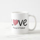 This modern minimalist coffee mug features a bold black "LOVE" typography design accented by a hand-drawn, vibrant red scribble heart. The front and back include customizable text templates, allowing you to easily add names, an anniversary date, or a heartfelt message. Designed for couples who love contemporary art, this chic mug makes a thoughtful gift for weddings, engagements, or Valentine's Day. The high-contrast black and red palette ensures the design stands out in any kitchen or office.