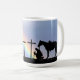 Vaquero rezando con su caballo y una impresionante taza de café con arco iris