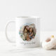 Create your own custom photo coffee mug. This cup features two of your favorite pictures in a circle shaped watercolor brush stroke frame and personalized text for any occasion. A great gift for family and friends or your own photo memory keepsake.