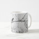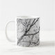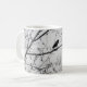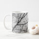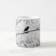 Fotografía en blanco y negro de un pájaro negro encaramado en una rama de un árbol. Las ramas de los árboles tienen semillas colgando de ellas. Las ramas y las semillas crean un fondo abstracto alrededor del pequeño animal negro. Fotografía Copyright ©Kimberly J Tilley.