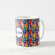Cuadros pintados de manchas en azul, naranja, rojo y blanco cubren esta taza colorida. Personaliza tu nombre con una insignia circular. Agradable, divertido y peculiar.