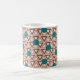Esta taza tiene un diseño geométrico de triángulos repitiendo marrón y marrón con círculos turquesas sobre un campo de blanco roto. ¿Quieres el mismo diseño en colores diferentes? Mándame un mensaje.