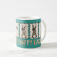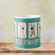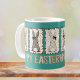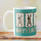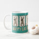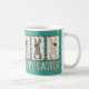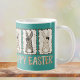 This cute teal Easter mug features cute coquette bunnies with animal print and checkerboard patterns, wearing cute hand-drawn brown bows in shades of brown and tan. Happy Easter is printed in playful type and coordinating colors underneath on both sides of the mug. The bunnies are posing against a color block of teal.