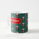 Santa Claus on a Christmas mug. Use "Personalize this template" to change the "Merry Christmas!" text and create a unique, customized gift; text changes are reflected on both sides. Enjoy a warming hot chocolate at Christmas in this mug, featuring a busy repeat of Father Christmas doing a star jump. Drawn in a retro, pixel art style, a traditional Santa Claus decked in red suit and hat with white fur trim, black boots and belt with a gold buckle, brown mittens and a fluffy white beard.